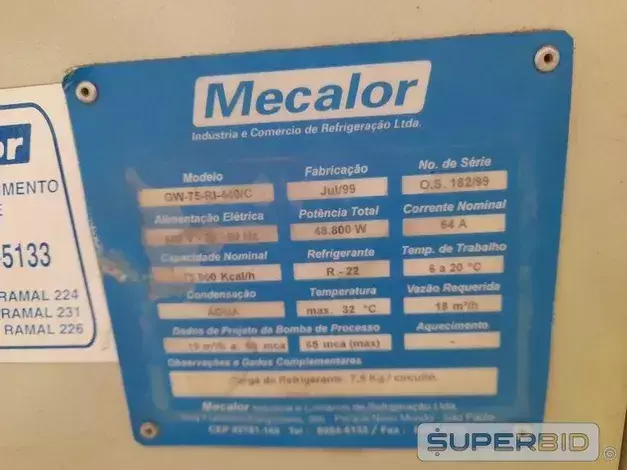 O Chiller Compacto Mecalor Umag GW-75-RI-440/C, ano 1999, série 182/99, é uma solução eficiente para sistemas de refrigeração industrial. Com capacidade de 75.000 Kcal/h e potência de 48.800 W, opera em tensão de 440 V e corrente nominal de 64 A. Projetado para temperaturas de trabalho entre 6 a 20 °C, possui vazão requerida de 18 m³/h e utiliza gás refrigerante R-22. Seu sistema elétrico é regular, garantindo confiabilidade para aplicações diversas. Ideal para quem busca desempenho e durabilidade em equipamentos compactos.